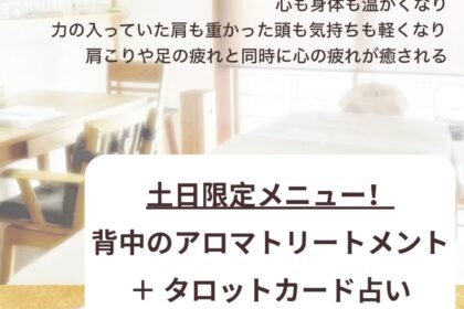 | 全身(背中・脚・お腹・デコルテ・ヘッドヒーリング・足浴)、お着替えが必要です。 | 180分 10,000円 |