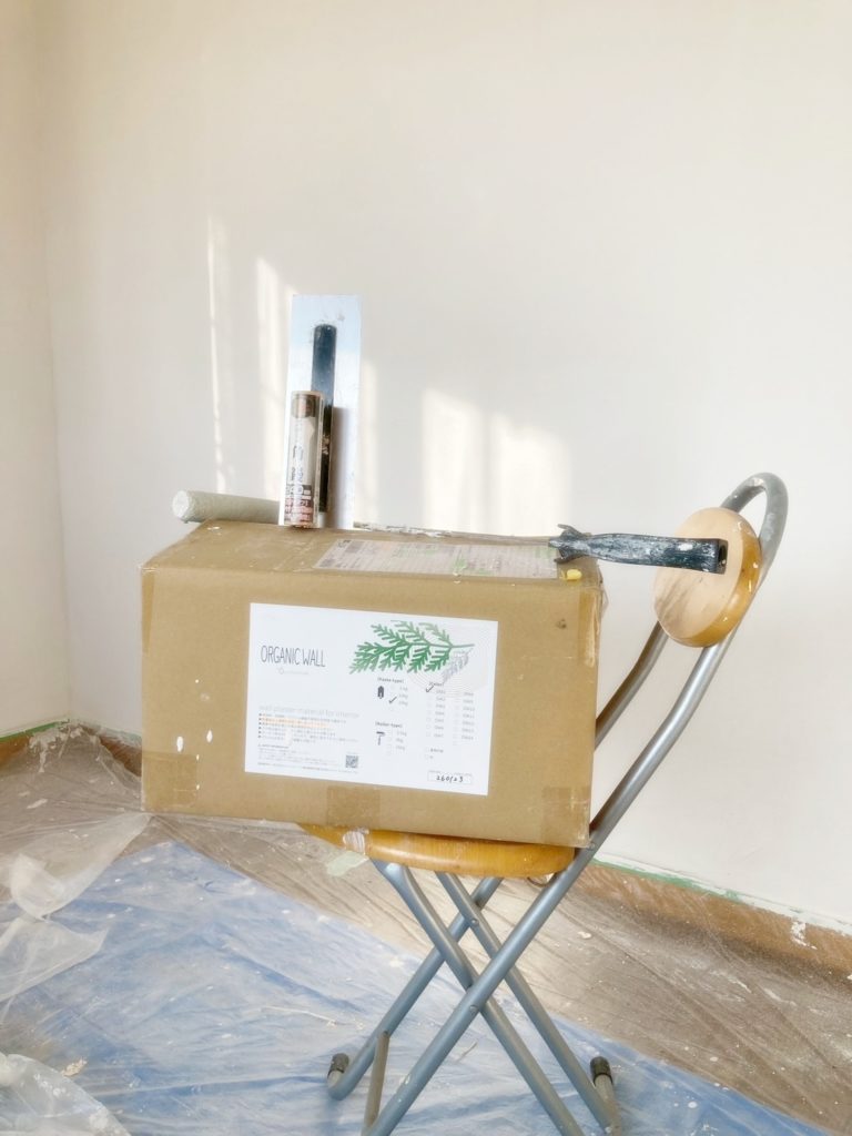別宅の壁に、家族でヒノキチオール配合の珪藻土を塗っています。